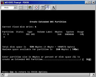 แต่ในกรณีที่จะแบ่งเป็นไดร์ฟอื่นอีกก็ให้พิมพ์ระบุตัวเลขที่จะทำเป็นไดร์ฟ C ในช่องเลขบอกจำนวนจะพิมพ์เป็นเปอร์เซ็นต์หรือจะพิมพ์เป็นจำนวนเม็กกะไบต์ก็ได้ถ้าเป็นจำนวนเม็กกะไบต์ก็ไม่ต้องพิมพ์ % ในที่นี้สมมติว่าฮาร์ดดิสก์ 520 MB จะเป็นไดร์ฟ C เพียง 50 เปอร์เซ็นต์ ให้พิมพ์ 50% ในช่องจำนวนเลขของฮาร์ดดิสก์ดังนี้ (520) (50%) โดยพิมพ์ทับเลข 520 เลยแล้วกด Enter หลังจากนั้นจะได้ไดร์ฟ C มา ให้กดปุ่ม ESC เพื่อกลับไปรายการหลัก